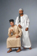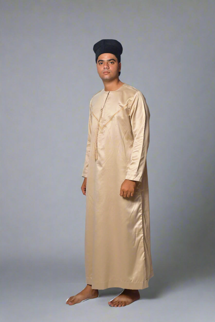 Zahab Al-Nur embodies the light of honor and celebration. This golden kurta is made from luminous shiny fabric that reflects warmth, joy, and barakah. Perfect for Eid, Nikah, or any special day where your presence deserves to shine — without excess, yet with unmistakable grace. It captures the soul of Islamic festivity with refined elegance.